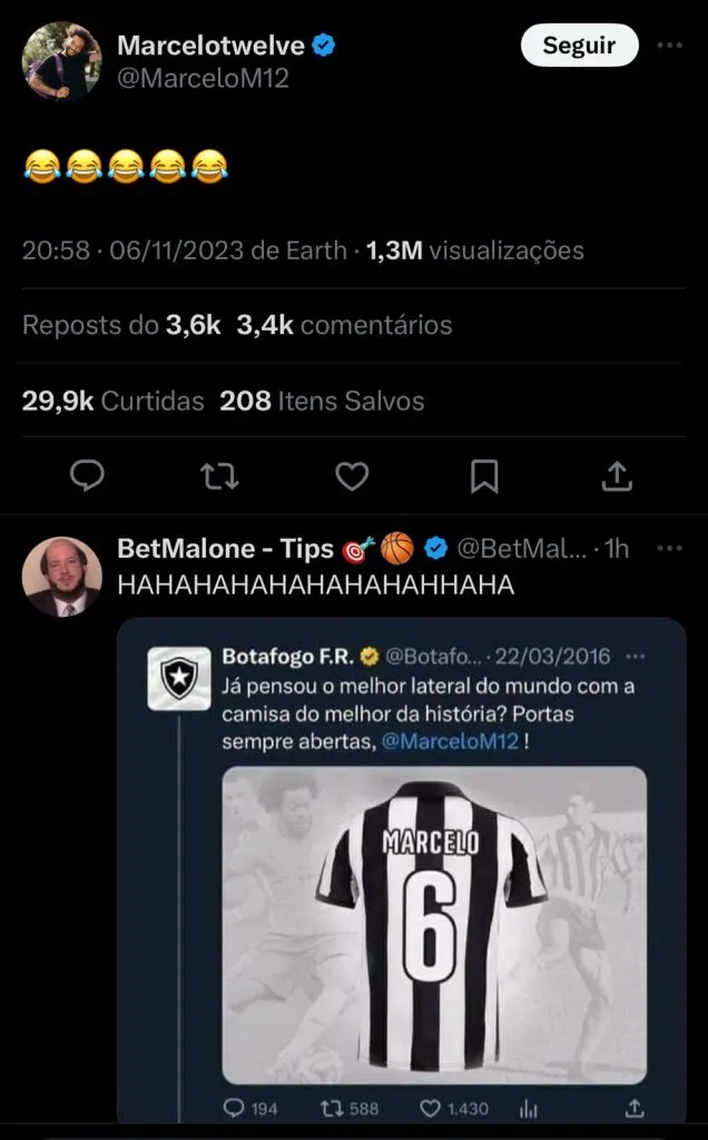 O lateral do Fluminense e recém-campeão da Copa Libertadores, Marcelo, fez um tweet enigmático com emojis de risada. Muitos torcedores acreditam que seja uma provocação ao Botafogo após a derrota.