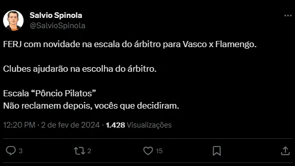 “Caso haja consenso entre os clubes em torno de um só árbitro, o sorteio será dispensado, ficando este escalado para a partida. O sorteio, se necessário, será aberto à imprensa”, diz trecho do comunicado da FERJ.