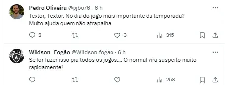 Minutos depois de divulgar o relatório, Textor apagou a publicação inicial que dizia: “ Botafogo, dia de jogo amanhã! Apito por apito, todos precisam melhorar o seu jogo. Vamos!”