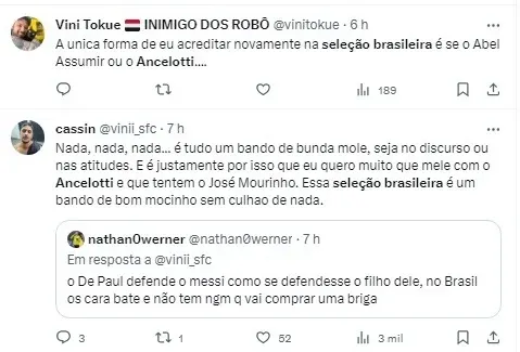 “Ficou claro que a incompetência está em todas as esferas da CBF, desde o comando lá de cima até mesmo na comissão técnica, passando ainda pelos jogadores, pela organização dos jogos, por todo o lado. Quando vimos a confusão para começar o jogo e o presidente da AFA (Associação de Futebol da Argentina) estava dentro de campo, não havia ninguém do Brasil. Fernando Diniz foi questionado sobre o que estava acontecendo e disse: ‘não sei’. A CBF não tem um representante?”, disse.