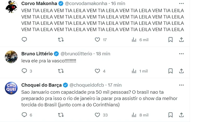 “Vem, tia Leila, vem, tia, Leila, vem, Tia Leila”, diz um torcedor. “São Januário com capacidade pra 50 mil pessoas? O Brasil nao ta preparado pra isso, o Rio de Janeiro ia parar pra assistir o show da melhor torcida do Brasil (junto com a do Corinthians)”