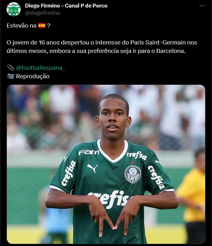 De acordo com as informações publicadas pelo portal “Football España”, o atacante Estevão, de apenas 16 anos de idade, atrai o interesse do Paris Saint-Germain (PSG), mas sua preferência e ir ao time catalão.