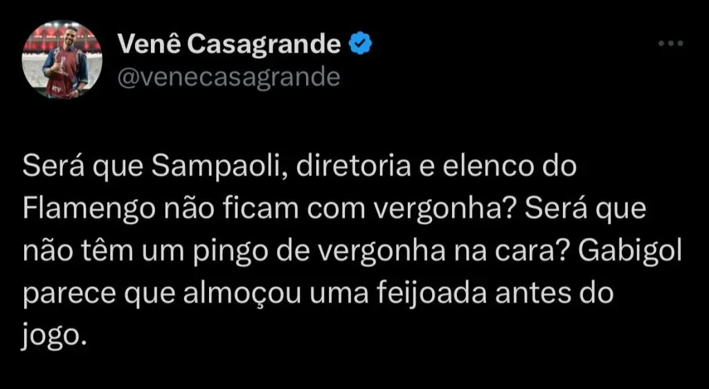 “Será que Sampaoli, diretoria e elenco do Flamengo não ficam com vergonha? Será que não tem um pingo de vergonha na cara? Gabigol parece que almoçou uma feijoada antes do jogo.” afirmou Venê Casagrande.