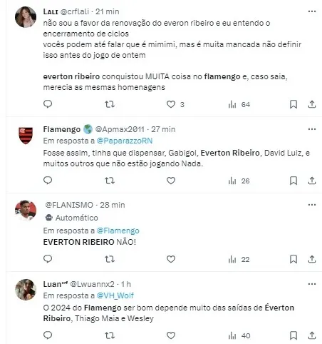 “O departamento de futebol defende a renovação por mais uma temporada, só que a outra ala, que foi contra a renovação do Gabigol, também é contra a renovação do Everton Ribeiro por entender que é um jogador que não entrega mais e tem um custo elevadíssimo. Duvido que ganhe menos de R$ 1 milhão no Flamengo.”, completou.