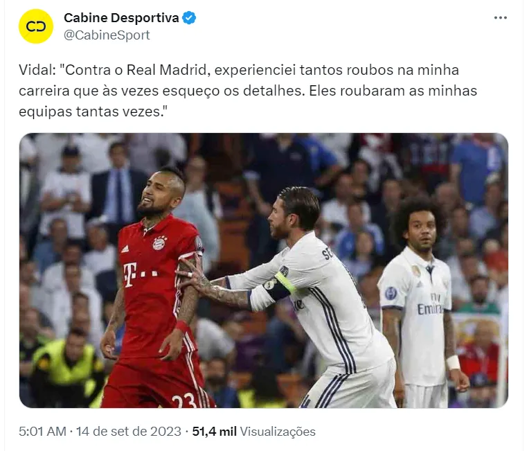 “Contra o Real Madrid sofri tantos roubos na minha carreira que às vezes esqueço os detalhes. Eles roubaram das minhas equipes tantas vezes”, disse Vidal. A fala de Vidal repercurtiu bastante no futebol europeu, já que o atleta é bem conhecido lá fora.