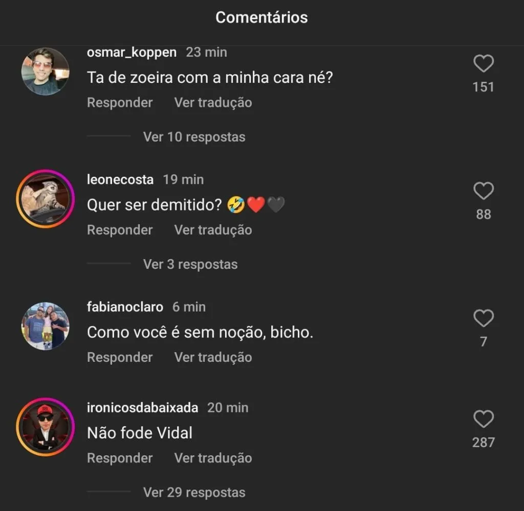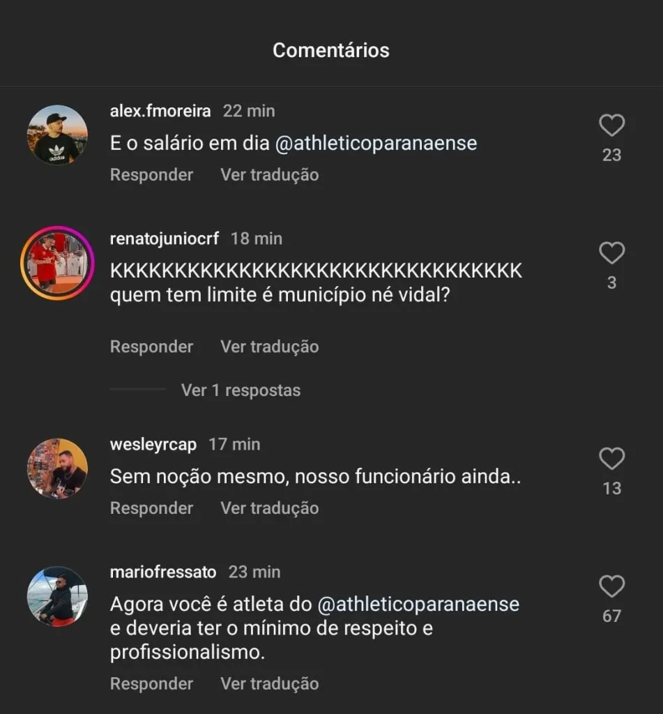 Na postagem, a torcida do Athletico PR ficou furiosa com a atitude de Vidal. Um torcedor diz: “Deveria ter o mínimo de respeito”. Lembrando que o contrato do chileno está chegando ao fim.