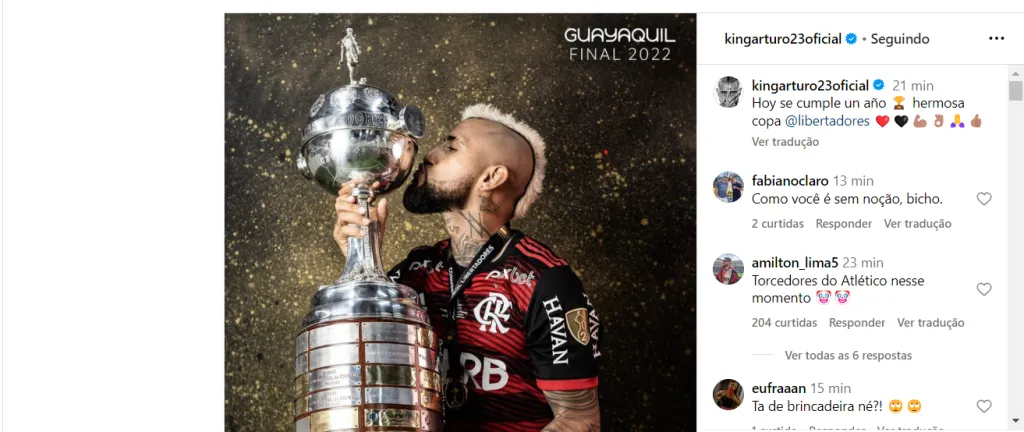 “Hoje se completa um ano. Linda Copa Libertadores”, diz a postagem de Vidal, em qual ele aparece beijando a taça, com as cores do Flamengo.