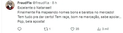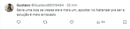 Segundo o jornalista, o lateral direito Natanael, do Coritiba, entrou em pauta e a diretoria cogita uma oferta caso negocie os jogadores citados acima. Vale lembrar que o jogador desperta interesse também de Red Bull Bragantino e São Paulo.