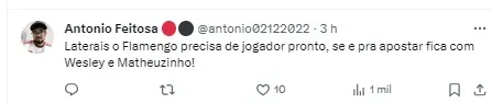 Mesmo já sabendo de saídas, e prováveis chegadas, nem só isso o Flamengo fará nesta primeira janela. O clube negocia e remanejará alguns jogadores para o próximo ano, segundo informações do jornalista Junior Miguel Neto. Na lateral-direita, por exemplo, Matheusinho deve ser o primeiro a puxar a fila, além de Wesley, com alguns clubes de olho.