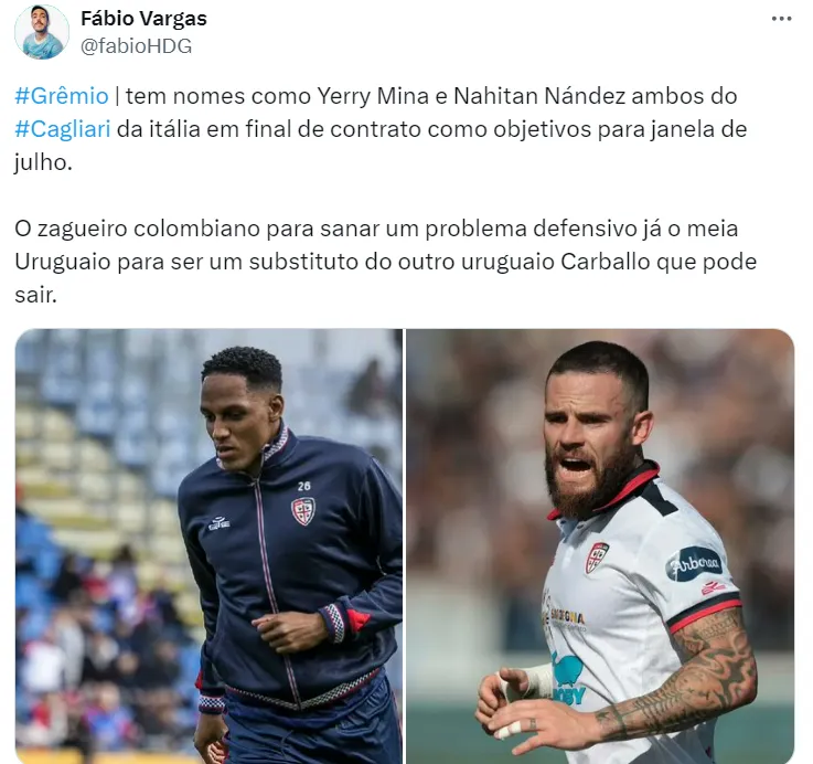 Outro jogador do Cagliari que volta à pauta gremista é o meio-campista Nahitan Nández, de 28 anos de idade, que também está em fim de contrato no futebol italiano, e chegaria ao Tricolor sem custos. A ideia dos gaúchos é tentar se aproximar do atleta a partir de junho.