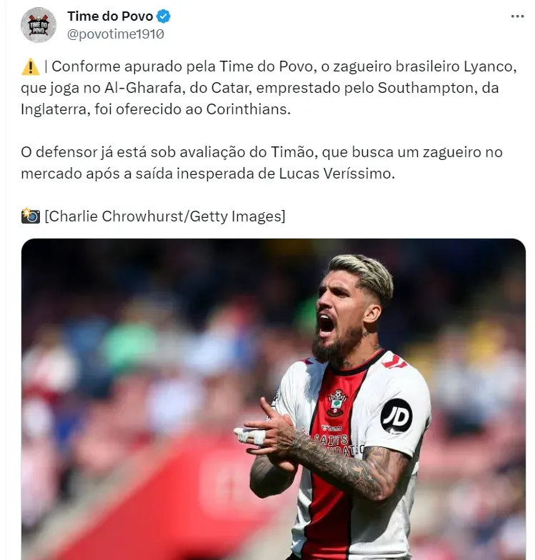 De acordo com informações do canal o Time do Povo, o zagueiro Lyanco, de 26 anos de idade, ex-São Paulo e atualmente jogando no Catar, sob empréstimo do Southampton, foi oferecido ao Timão.