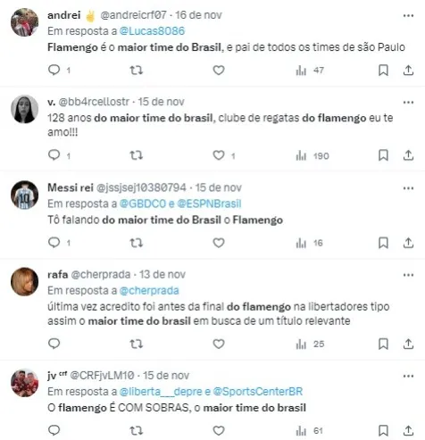 “Maiores audiências de jogos da Libertadores…falando da emissora que trabalho, a ESPN, mas se pegar da Globo também vai ser a do Flamengo. Então, estou te falando vários argumentos que fazem do Flamengo o maior clube do Brasil. No Flamengo tudo é maior”, acrescentou.