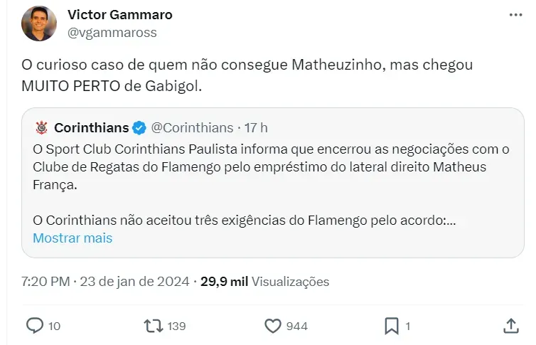 Matheus França esteve perto de ir para o Corinthians, chegou a treinar no time do Timão, mas o Flamengo e o clube de Itaquera não chegaram a um acordo e assim o lateral está de volta ao Rio de Janeiro.