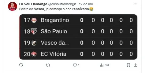 Ele lembrou que na temporada passada, o Cruzmaltino escapou do rebaixamento apenas na última rodada, ao vencer o Red Bull Bragantino em São Januário.