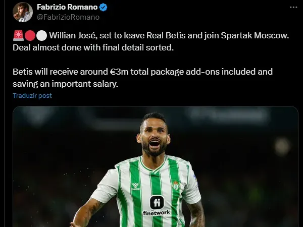 “Willian José, prestes a deixar o Real Betis e ingressar no Spartak Moscou. Negócio quase concluído com detalhes finais resolvidos”, informa o jornalista nesta quarta-feira (26).