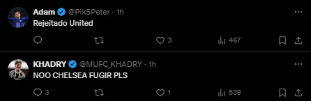 Conforme o jornalista, os Red Devils exploram outras possibilidades de fazer negócio pelo atacante. Enquanto isso, os Blues estão dispostos a pagar a cláusula de rescisão de 60 milhões de euros (cerca de R$ 415 milhões).