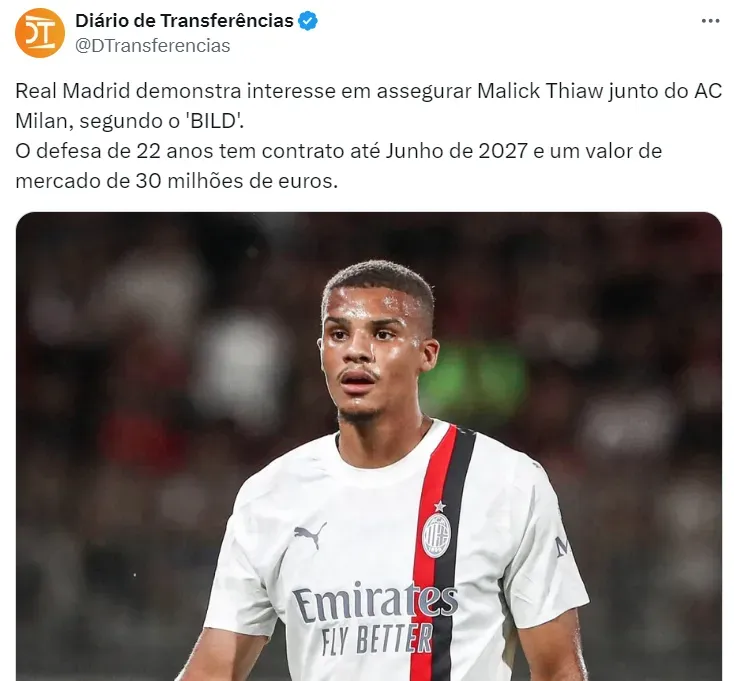 Malick Thiaw pertence ao Milan e tem contrato com os italianos até a temporada de 2027. No mercado, o zagueiro é avaliado em 30 milhões de euros (R$ 166 mi). O clube merengue concorda em pagar esse valor.