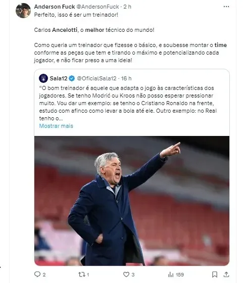 “Estou incrivelmente grato aos meus jogadores pelo trabalho árduo que demonstraram. Esta é, sem dúvida, a melhor equipe que já tive o privilégio de comandar em toda a minha carreira”, declarou Ancelotti em entrevista à TNT Sports.