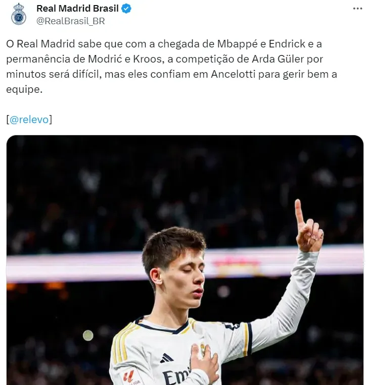 A diretoria do Real Madrid tem total confiança em Ancelotti para lidar com a certa falta de minutos que Arda Guler terá em 2024-25. Endrick e Mbappé não são jogadores da mesma posição, mas chegarão com mais moral na Espanha.