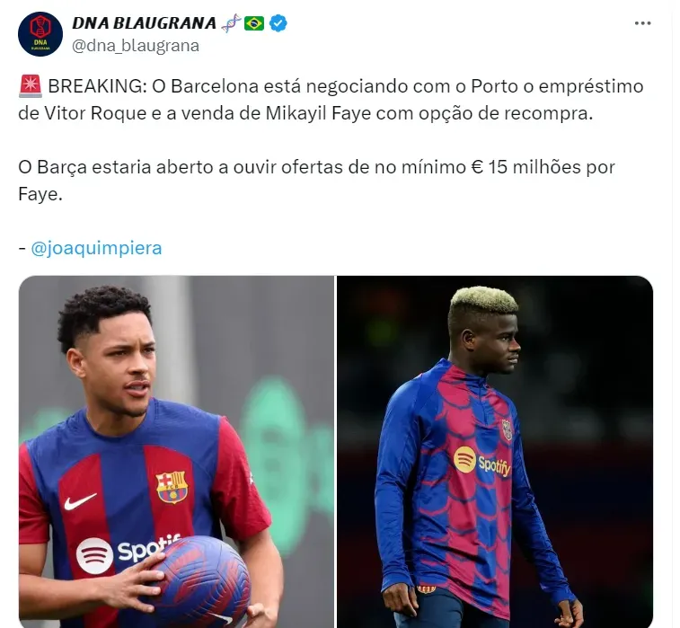 Torcedores do Barcelona não esperavam o movimento de emprestá-lo, uma vez que Lewandowski não tem nenhum reserva de alto nível no elenco. Junto com Roque, Faye também irá ao Porto, mas em acordo definitivo.