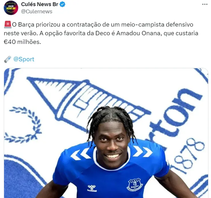 O nome que surge como favorito para reforçar o time de LaLiga é Onana, do Everton, que passou a ser a prioridade do clube catalão no mercado. A informação é do jornal Sport, da Espanha.
