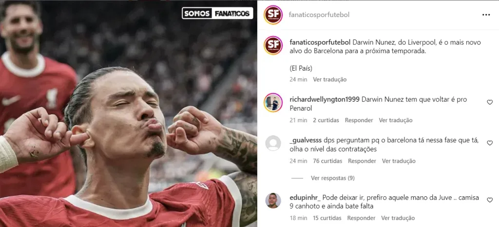 Núñez tem contrato com o Liverpool até 2028. Ele chegou aos Reds em 2022, após se destacar com as cores do Benfica, de Portugal. No mercado, Darwin é avaliado em 70 milhões de euros.