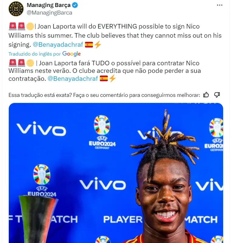 Contratar um jogador do nível de Mbappé está fora do alcance do gigante catalão neste momento, mas Nico Williams, que faz uma grande Eurocopa, parece ser a aposta do Barcelona, como uma oportunidade de reforçar o time de Flick e também dar uma resposta ao seu maior rival na Espanha.