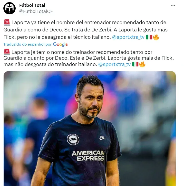 A informação é passada pela imprensa espanhola (SportXtra TV), que frisa que o nome de De Zerbi ganha força para assumir o Barcelona em meio a recomendação de Guardiola.