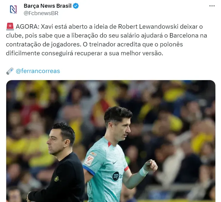 De acordo com informações de Ferran Correas, o treinador catalão acredita que não vai conseguir recuperar o melhor nível de Lewandowski, que já foi considerado o melhor camisa 9 do mundo por vários anos.