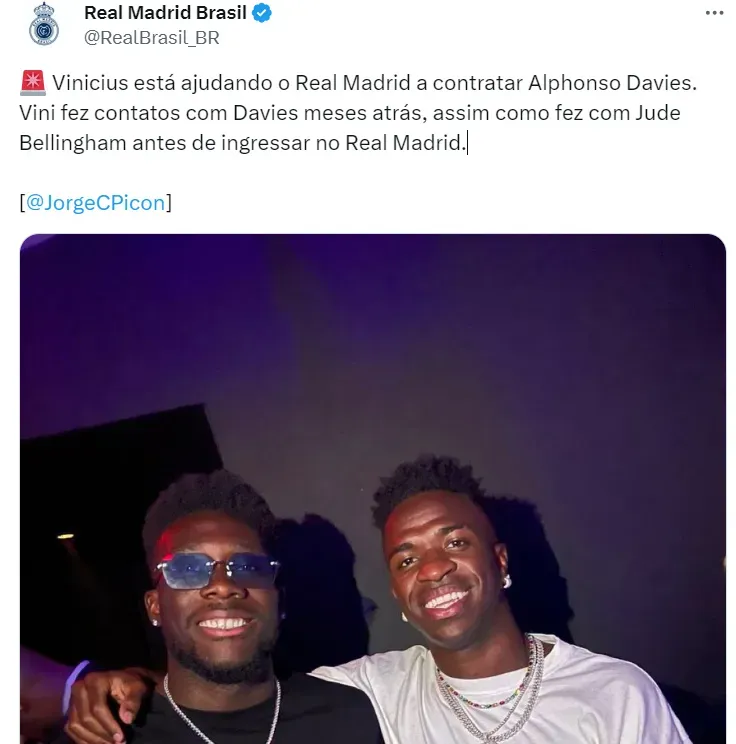 Agora, Vinicius Jr. está em contatos para facilitar a possível chegada do lateral Davies para a próxima temporada do futebol europeu. Amigos fora de campo, a ideia de Vinicius é passar para o atleta como é o clube, estrutura, clima, companheiros e etc.