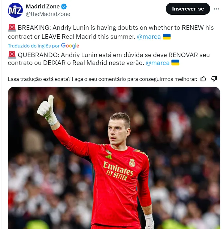 O goleiro Lunin, do Real Madrid, é um dos fortes alvos do time de Old Trafford para a próxima temporada. O ucraniano foi campeão da Champions League na temporada, mas tem dúvidas sobre seu futuro.