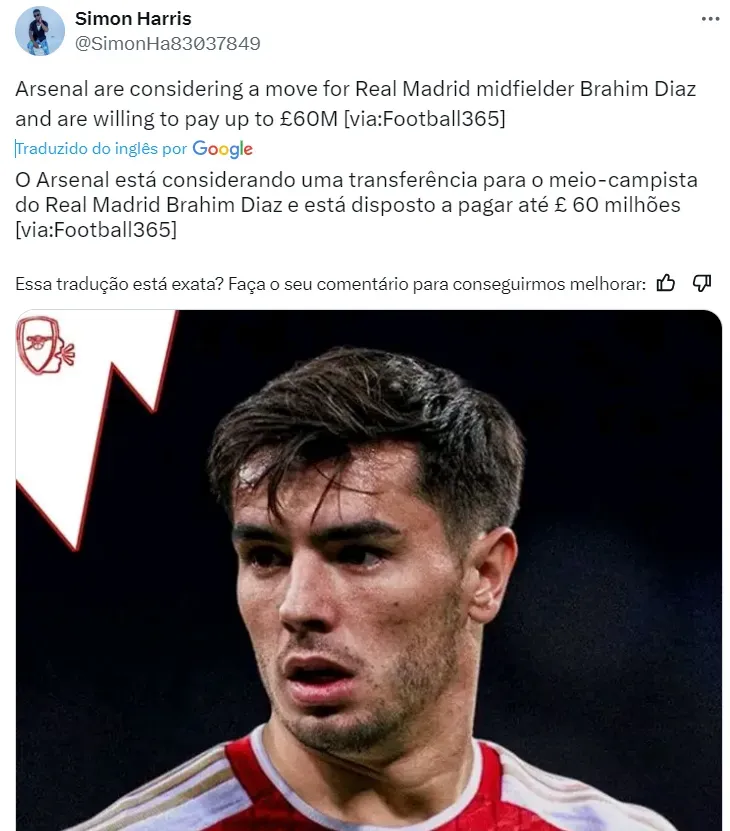 Informações do jornal Mundo Deportivo dão conta que o Real Madrid está aberto a negociar o futebol de Brahim Díaz na próxima temporada do futebol europeu por um valor de 60 milhões de euros.