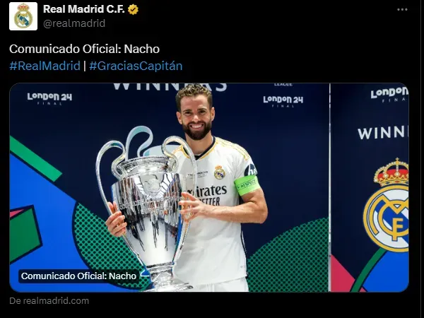 “O Real Madrid anuncia que o nosso capitão Nacho decidiu encerrar a carreira como jogador do Real Madrid. Queremos expressar a sua gratidão e carinho a Nacho, uma das grandes lendas do nosso clube”, destacou a equipe.