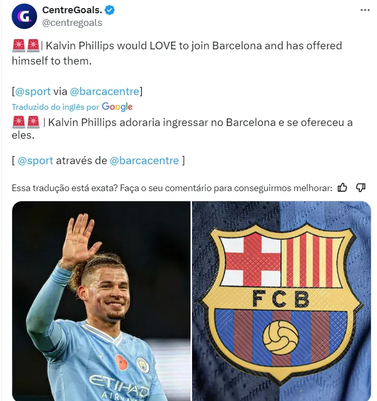 Kalvin Phillips também deseja jogar na Catalunha e, segundo informações do jornal Sport, o meio-campista, que está sem espaço no Manchester City, teria se oferecido ao clube espanhol para um acordo dentro dos padrões financeiros.