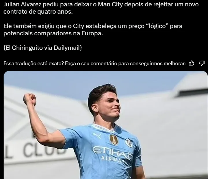 A informação de que Julian Álvarez teria pedido para deixar o Manchester City foi passada por Mario Benito, do El Chiringuito TV. Segundo ele, o atacante campeão do mundo recusou a última abordagem de renovação contratual.