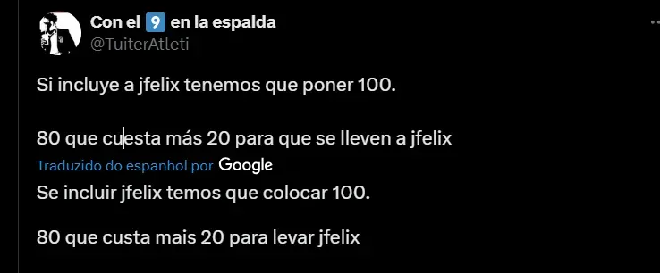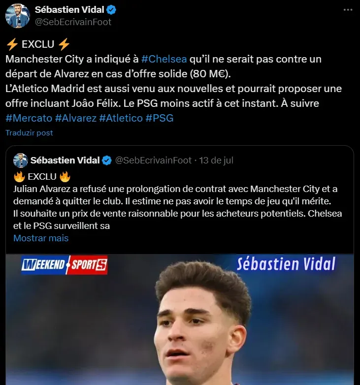 Para o Atlético Madrid, esse valor é alto. Assim, o clube espanhol está aberto em oferecer o futebol de João Félix, como uma tentativa de diminuir o valor de Álvarez, segundo informações de Sébastien Vidal, do portal Weekend Sports.