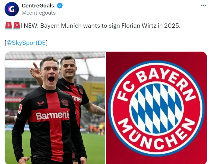 De forma oficial, o Bayern de Munique é o mais novo interessado em Wirtz e, atualmente, parece ser o time mais próximo na tentativa de tirá-lo do rival da Bundesliga, seja na próxima temporada ou em 2025.