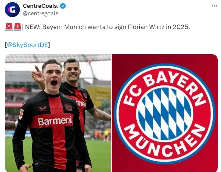 De forma oficial, o Bayern de Munique é o mais novo interessado em Wirtz e, atualmente, parece ser o time mais próximo na tentativa de tirá-lo do rival da Bundesliga, seja na próxima temporada ou em 2025.