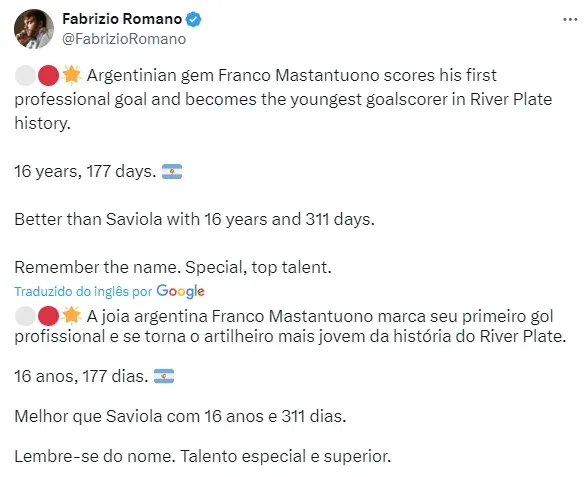 Porém, agora, o Real Madrid pode acabar sofrendo um chapéu. Meia, Mastantuono já vem atuando pelo time principal. Em 2024, soma 17 jogos disputados, com dois gols e uma assistência.
