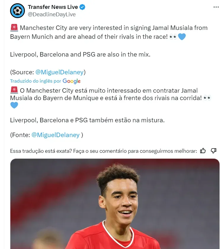 Segundo Miguel Delaney, o Manchester City se tornou o grande favorito pela contratação de Musiala na próxima temporada. Ele conta que o time de Manchester superou a concorrência pelo jovem talento.
