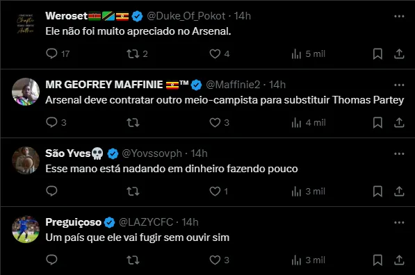 Partey chegou à Premier League em 2020, quando deixou o Atlético de Madrid, de Diego Simeone. Desde então, o ganês acumulou 188 jogos no Arsenal, com 16 gols e 11 assistências.