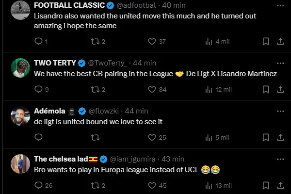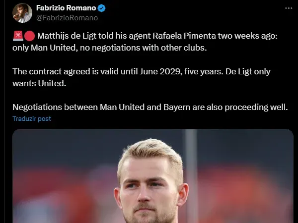 “Matthijs de Ligt disse à sua agente Rafaela Pimenta há duas semanas: apenas o Manchester United, sem negociações com outros clubes”, destaca o jornalista Fabrizio Romano.