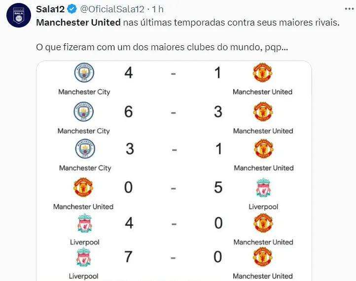 Enquanto segue brigando apenas pelas vagas nas competições da UEFA, o Manchester United vê seus dois maiores rivais, Liverpool e Manchester City, no topo, fato que deixa qualquer torcedor aterrorizado.