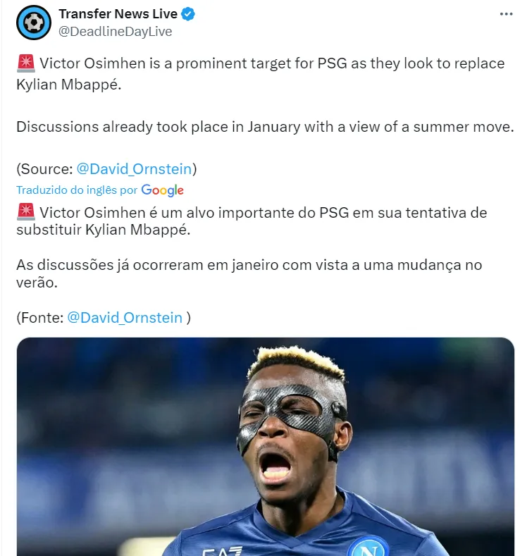 As conversas entre PSG, Napoli e atleta são consideradas avançadas pelo jornalista. Osimhem é um atacante goleador que poderia entregar um número alto para o clube.