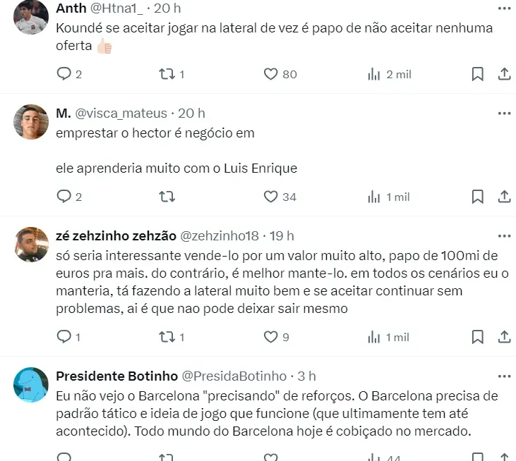 Avaliado em 50 milhões de euros, o francês tem contrato com o Barça até a temporada de 2027. Na temporada, Koundé é titular na maioria dos jogos com Xavi, mas o entendimento é que o zagueiro prioriza jogar na zaga, algo que não vem acontecendo.