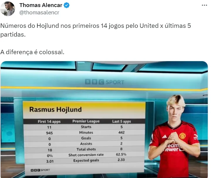 Hojlund foi contratado pelo Manchester United nesta temporada. Ele se destacou com as cores da Atalanta, da Itália. No United, o começo foi difícil, mas ele superou a desconfiança e vive grande fase.