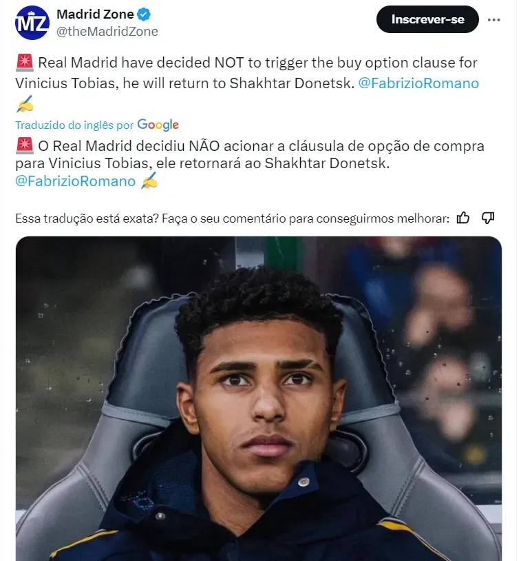 Se esses jogadores estão chegando, o brasileiro Vinicius Tobias está de saída do Real Madrid. O lateral-direito ex-Internacional, que está emprestado ao clube merengue, voltará ao futebol ucraniano para a próxima temporada, segundo informações do jornalista Fabrizio Romano.