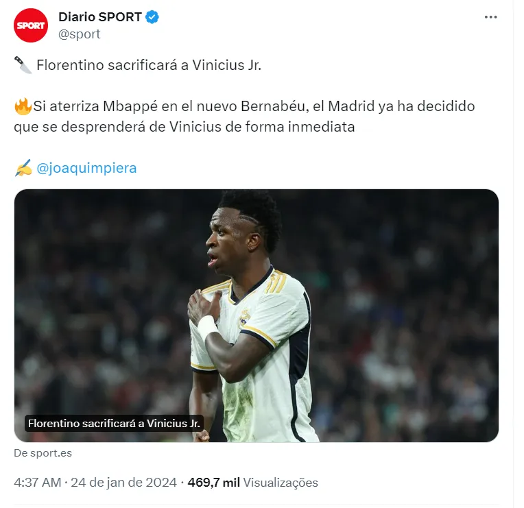 Em caso de sucesso, Florentino Pérez teria decidido que Vini Jr. deixará a equipe, pois os atletas ocupam o mesmo lado de campo e, na preferência, o cartola entende que Mbappé é superior a Vinicius.