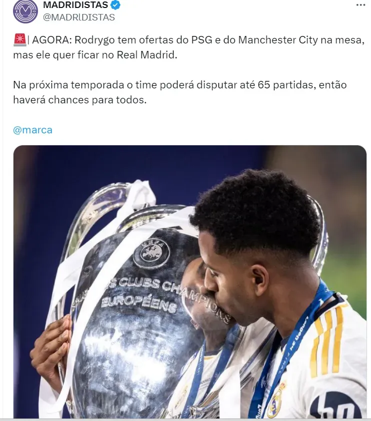 A contratação de Mbappé poderá fazer com que Rodrygo perca bastante minutos com Ancelotti na Espanha. O astro francês foi contratado para ser titular absoluto e isso deverá acontecer. Endrick não entra nesse caminho, mas, em caso de saída do brasileiro, ele pode ser visto como o substituto natural.