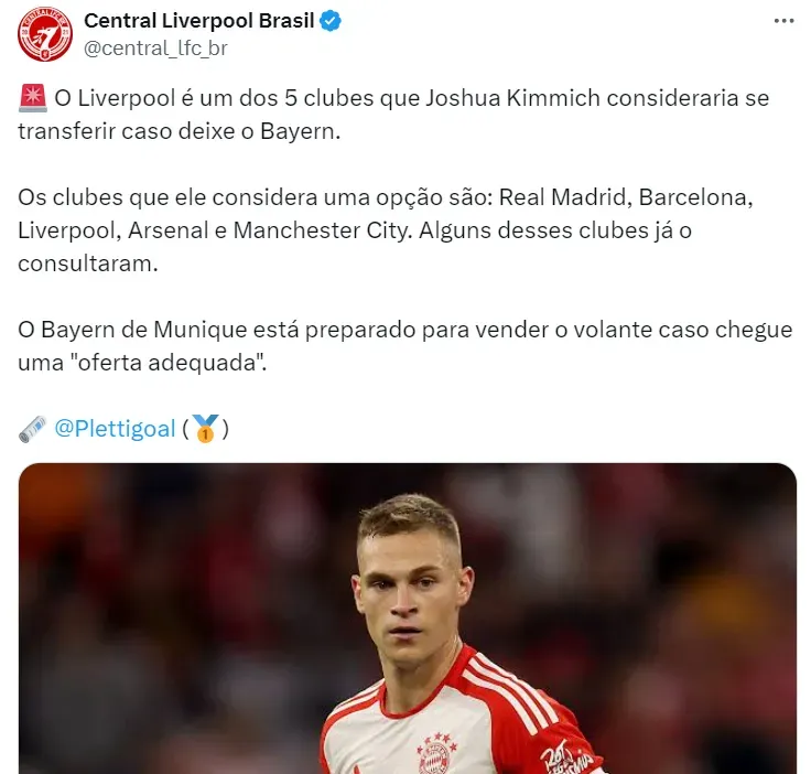 Segundo informações da imprensa de fora, Kimmich deseja viver um novo desafio na carreira e olha com carinho para cinco clubes do velho continente, sendo eles Liverpool, Manchester City, Real Madrid, Barcelona e Arsenal.
